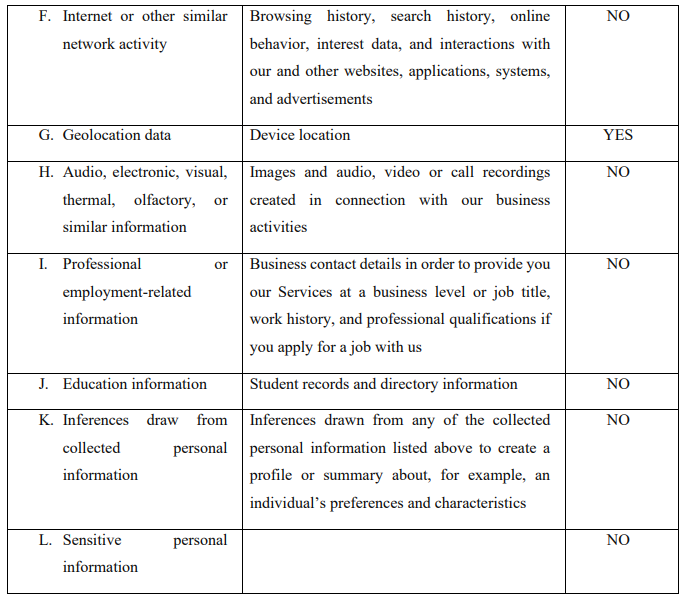 In Short: If you are a resident of California, Colorado, Connecticut, Utah, or Virginia, you are granted specific rights regarding access to your personal information. What categories of personal information do we collect? We have collected the following categories of personal information in the past twelve (12) months: